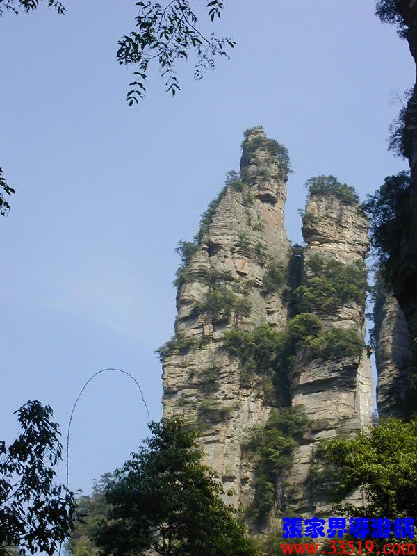 (金鞭巖、神鷹護(hù)鞭)如果要問張家界國家森林公園的標(biāo)志景點(diǎn),答案是現(xiàn)成的:金鞭巖。早在清代中期,一些文人就把張家界的峰林及百丈峽列入“永定八景”。其一叫“危峽啼猿”;其二叫“層巖涌塔”:“縣西二十里青崖山,其前五山并立,層峙如浮圖。中一峰更峻拔,上插宵漢,晴輝雪積,最擅奇觀。”這里說的“其中一峰”,指的金鞭巖。八大景點(diǎn)張家界占其二,可見先人是有眼力的。金鞭巖相對高度380多米,拔地而起,直插云霄,無論你遠(yuǎn)看近看,正看側(cè)看,都是一根刺破青天的長鞭!在金鞭巖左側(cè)的那座巖峰,大家看多像一只兇猛的老鷹,勾嘴瞪眼,雙翅略展,時(shí)刻警覺地守護(hù)著金鞭,人稱“神鷹護(hù)鞭”。