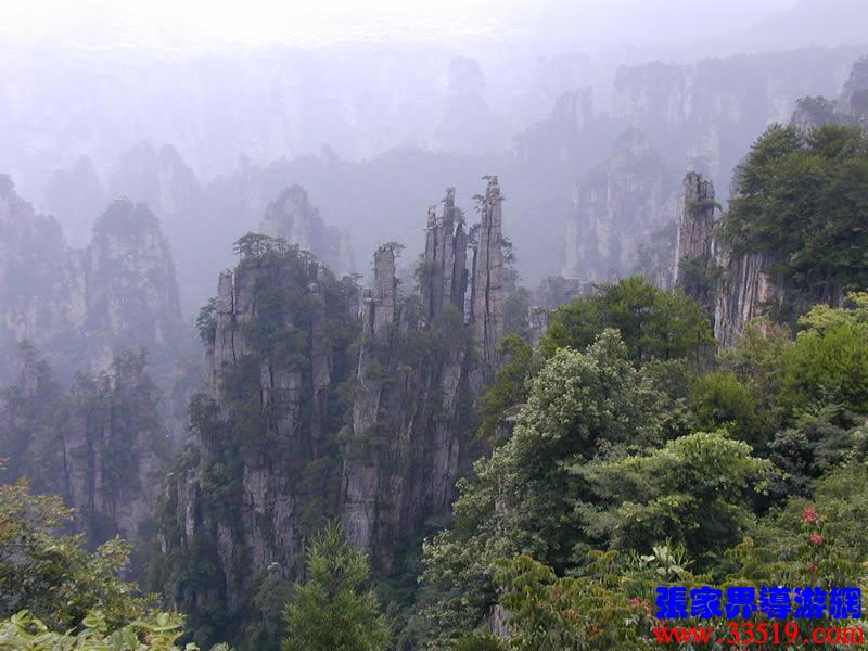 (大觀臺(tái))這就是大觀臺(tái)。極目遠(yuǎn)眺,千百座奇峰盡收眼底。一位詩人說,武陵源的砂巖峰林是一步一觀景,千步千造型,一山有四季,十步不同天。專家測(cè)算出武陵源石峰有3103座。一如一位高超的雕塑大師,模擬宇宙萬物,無不形狀逼真,維妙維肖,栩栩如生,呼之欲動(dòng)。有的如海螺出水,有的如金龜銜日,有的如蓮花盛開,有的如天橋橫空,有的如長(zhǎng)槍刺天,有的如寶塔聳立,有的如老人采藥,有的如玉女梳妝,有的如將軍出征,有的如戰(zhàn)馬長(zhǎng)嘯,有的如情人幽會(huì),有的如夫妻相擁,有的如仙女散花,有的如村姑守望.....有的孤峰獨(dú)秀,有的直插云霄,有的婷婷玉立,有的威武勇猛,有的小巧玲瓏,有的大氣磅礴。進(jìn)入武陵源,但見一片峰的森林,峰的世界,峰的海洋。挺拔、奇秀、集中、原始、粗獷、古野。這就是武陵源。一位藝術(shù)大師說:武陵源的山峰,改寫了山的概念。大攝影家陳勃說:“三山五岳堪比美,華夏風(fēng)光每一流。”王繼杰先生說:“武陵源上三日游,勝讀千篇李杜詩。”許世杰先生說:“秀幽險(xiǎn)峻稱奇絕,五岳黃山拜下風(fēng)。”李成瑞先生為此大抱不平:“神州勝景誰為最?須請(qǐng)霞公重評(píng)勘。”可惜徐霞客無緣到大觀臺(tái)來,也不可能為武陵源作甚評(píng)價(jià)了。