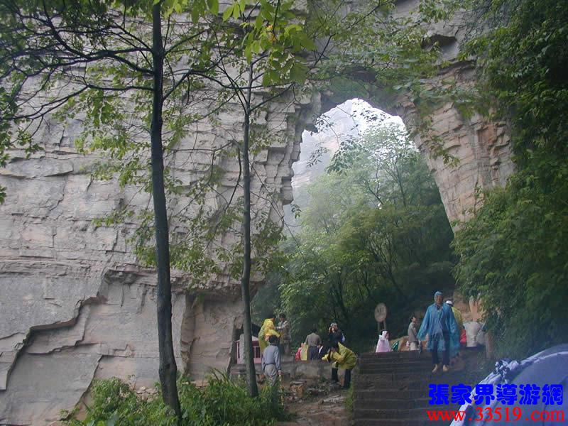 (南天門)大自然的造化真奇妙,利用一塊巨大的板狀石峰鑿出一扇大門,底寬10余米,高15米。相傳當(dāng)年屈原登天臺(tái)問天,就是從這里經(jīng)過的,故民間叫它“通天門”。據(jù)說向王天子在水繞四門苦練三年零六個(gè)月武藝,起事那天,就是立在這兒向皇宮連射三箭,流傳在武陵源民間的“三箭射皇宮”的典故就從此來。
