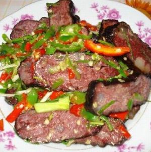 名稱: 血豆腐 介紹: 血豆腐,就是將豆腐和豬血、豬肉及花椒、辣椒等佐料拌成泥狀,捋成卵形,以竹篩置火炕上,煙熏烤成臘黃,吃起來耐嚼味香,是土家特色菜,當地人常以其下酒。 在張家界的飯館里很難吃到正宗的土家特色菜,可以去做土味的特色餐館去解解饞。但是最正宗還是鄉(xiāng)下人家家里自己熏的,那才叫一個好吃?。?!