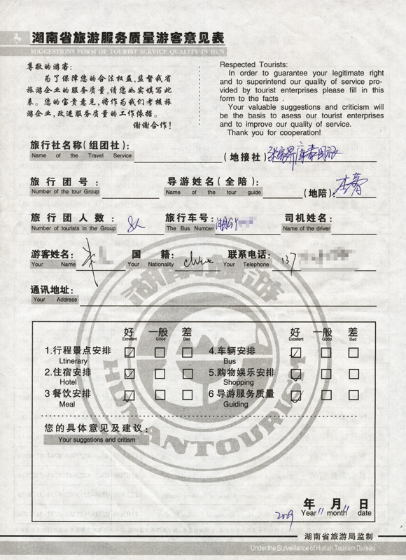 2009年11月11日朱先生一行8人旅游接待質(zhì)量反饋單