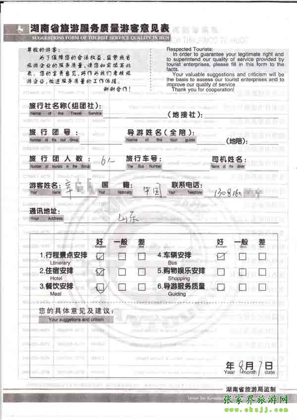 2010年8月7日山東辛先生一行6位旅游質量反饋