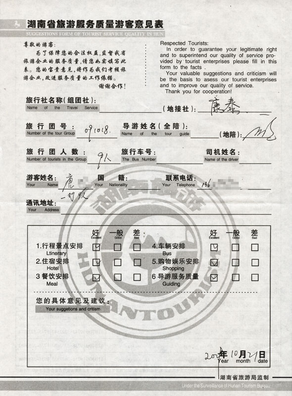 2009年10月18日唐先生一行9人接待質(zhì)量反饋單: