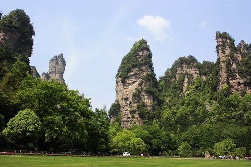 您好!張家界國家森林公園到了。這是公園大門.您看,這座大門一邊是具有當地土家族民俗風格的小青瓦園林式建筑,一邊配以砂巖石峰,將大門與自然巧妙地結合在一起。1992年5月28日,聯(lián)合國教科文組織派來考察驗收武陵源申報世界自然遺產事宜的兩個官員,在小車穿過公園大門駛進去百把米之后,連連呼喊:“門!門!”又讓司機把車倒回來,一邊贊不絕口欣賞大門返樸歸真的自然情凋,一邊頻頻按動相機的快門。因此,歡迎人家在這道“自然之門”前面,攝下自己的光輝形象。
