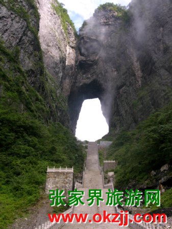 天門山古稱云夢山,又名玉屏山。坐落在張家界市區(qū)以南10公里處。公元263年,因山壁崩塌而使山體上 部洞 開一門,南北相通。三國時吳王孫休以為吉祥,賜名“天門山”。 天門洞,位于海拔1260多米的絕壁 之上,門洞高131.5米,寬37米。據(jù)地質(zhì)專家考證,門洞中央系東西巖層向 斜的交匯處,因擠壓而導(dǎo)致巖 石破碎崩塌,最終于263年形成門洞。天門山海拔1517.9米,因與山下市區(qū)相對高差達(dá)1300多米,故尤顯 偉岸挺拔,其天際線之美,堪為山的典型。